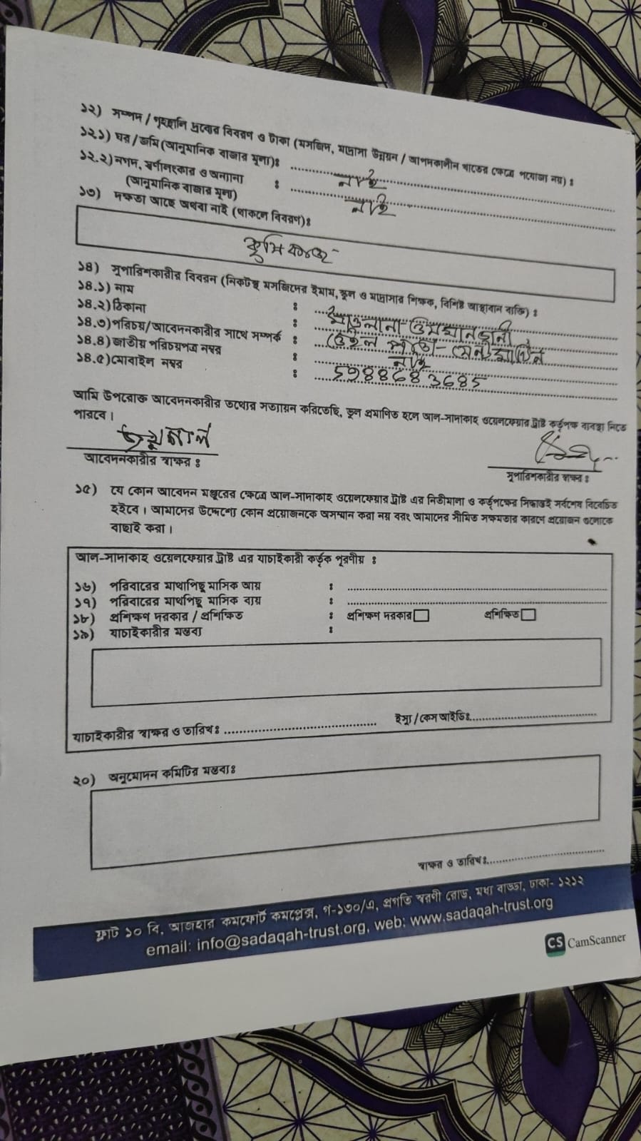 আমি জয়নাল আবেদীন ,একজন কৃষক। এবছর লবণ পানি উঠে এবং পোকার কারণে সেন্টমার্টিনে সমস্ত ফসল নষ্ট হয়ে গেছে। আমি অনেক কষ্টে পরে গেছি। ঘরে খাবারের চাউল পর্যন্ত নেই। তাই আল সাদাকাহ ওয়েল ফেয়ার ট্রাস্ট এর পক্ষ হইতে ,আমাকে কৃষি কাজে সহায়তা করলে অনেক উপকৃত হব।